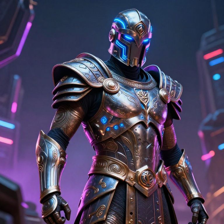 Sci fi greek armor worn by a futuristic warrior standing on a neon-lit battlefield, intricate metallic plating combined with ancient Greek motifs, glowing blue energy lines integrated into the helmet and chest piece, detailed and dynamic lighting effects