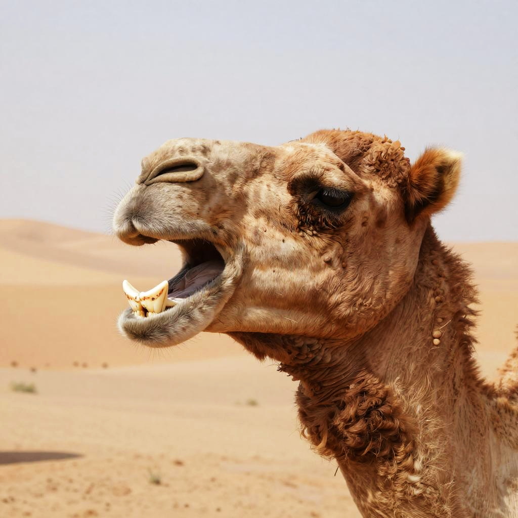 Sharp camel teeth visible as camel opens mouth, sandy dunes behind, bright daylight, hyper-realistic rendering, focus on unique teeth shape and texture