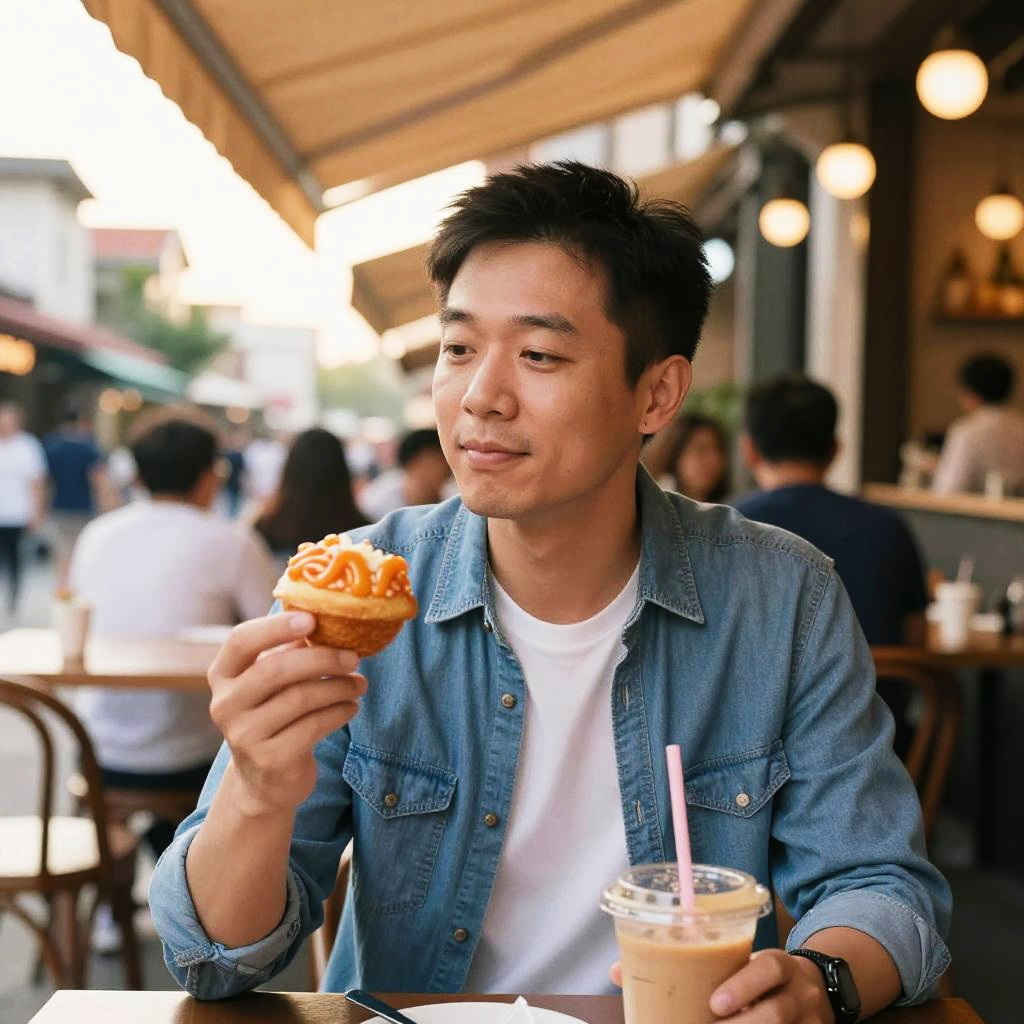 Person eating KFC late at night, neon lights reflecting, holding a drumstick with crispy coating, urban street food setting, moody lighting, relaxed vibe, detailed texture on chicken skin