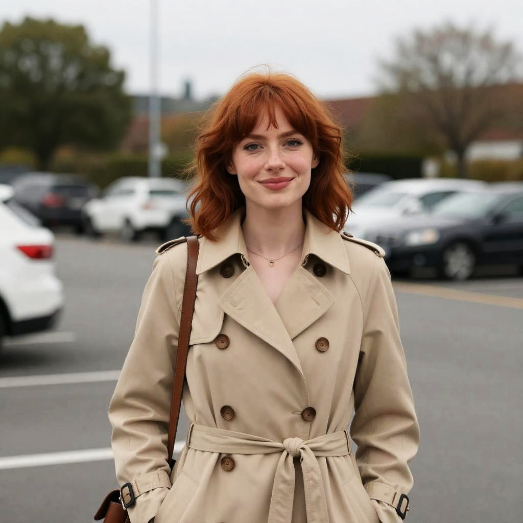 Red-haired woman with bangs, smiling slightly, wearing a beige trench coat, standing in a parking lot. Background includes blurred cars and trees. Overcast sky. She has a brown shoulder bag. Multiple cars in the background.