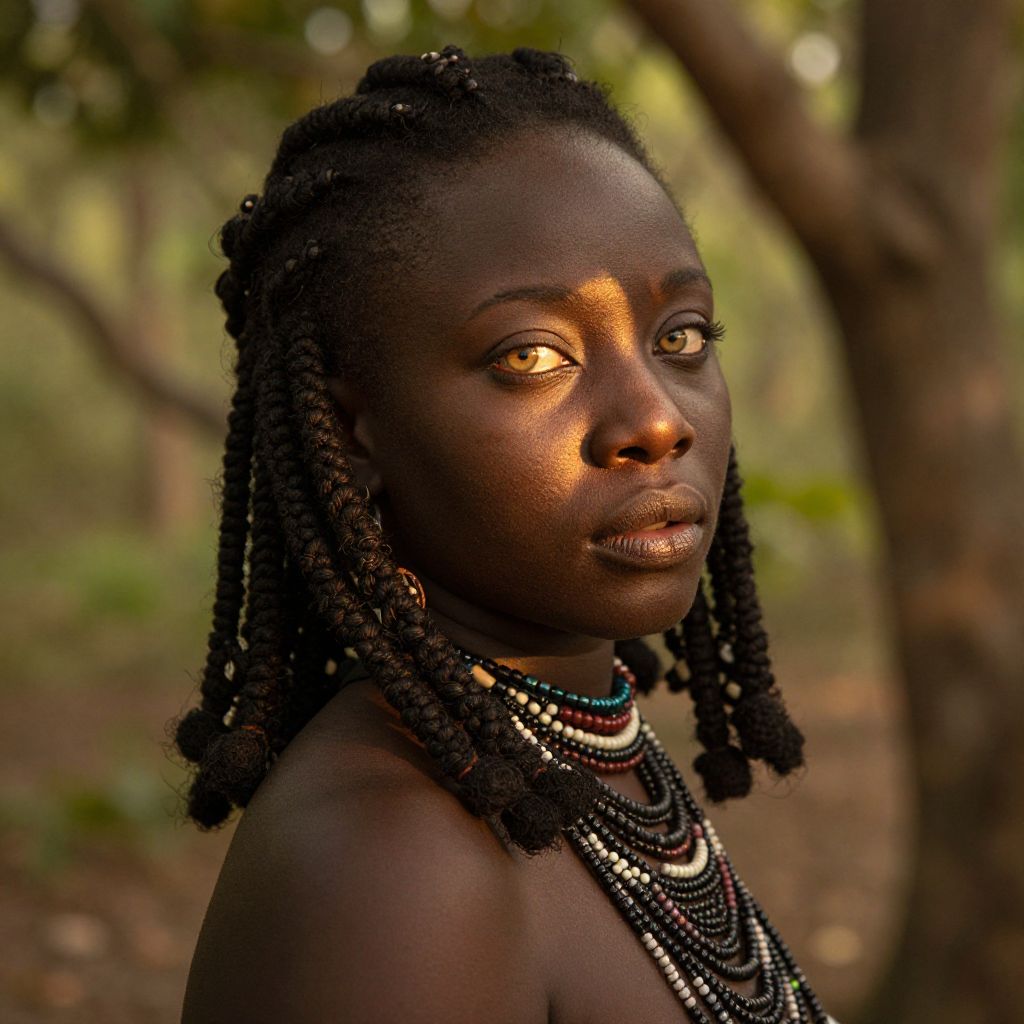 A photorealistic portrait photograph showcases an African woman's enigmatic allure with her striking hazel eyes and intricately coiled dark hair. Soft golden light filters through a canopy of leaves, illuminating her serene pose in the grove. Her expression exudes quiet strength and introspection from an unconventional 'over-the-shoulder' perspective, revealing subtle details of her intricate beaded jewelry and shadows dancing across her face. This captivating gaze invites viewers to explore the mysterious aura surrounding this enigmatic subject.