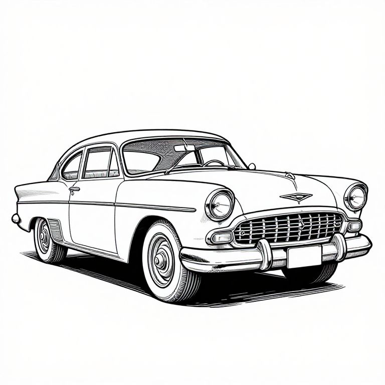 Photo to line art representation of a vintage car from the 1950s, featuring detailed mechanical parts and streamlined curves illustrated with precise, bold lines, accompanied by subtle cross-hatching for shadows, set on a simple neutral background to enhance clarity.