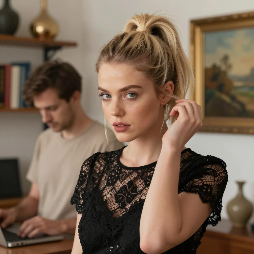 Photograph of a blonde woman with light skin and straight hair, smiling slightly at a man with dark hair, both in a bedroom. She wears a pink off-shoulder top, sitting on a bed with a wooden headboard. Lamp on right.