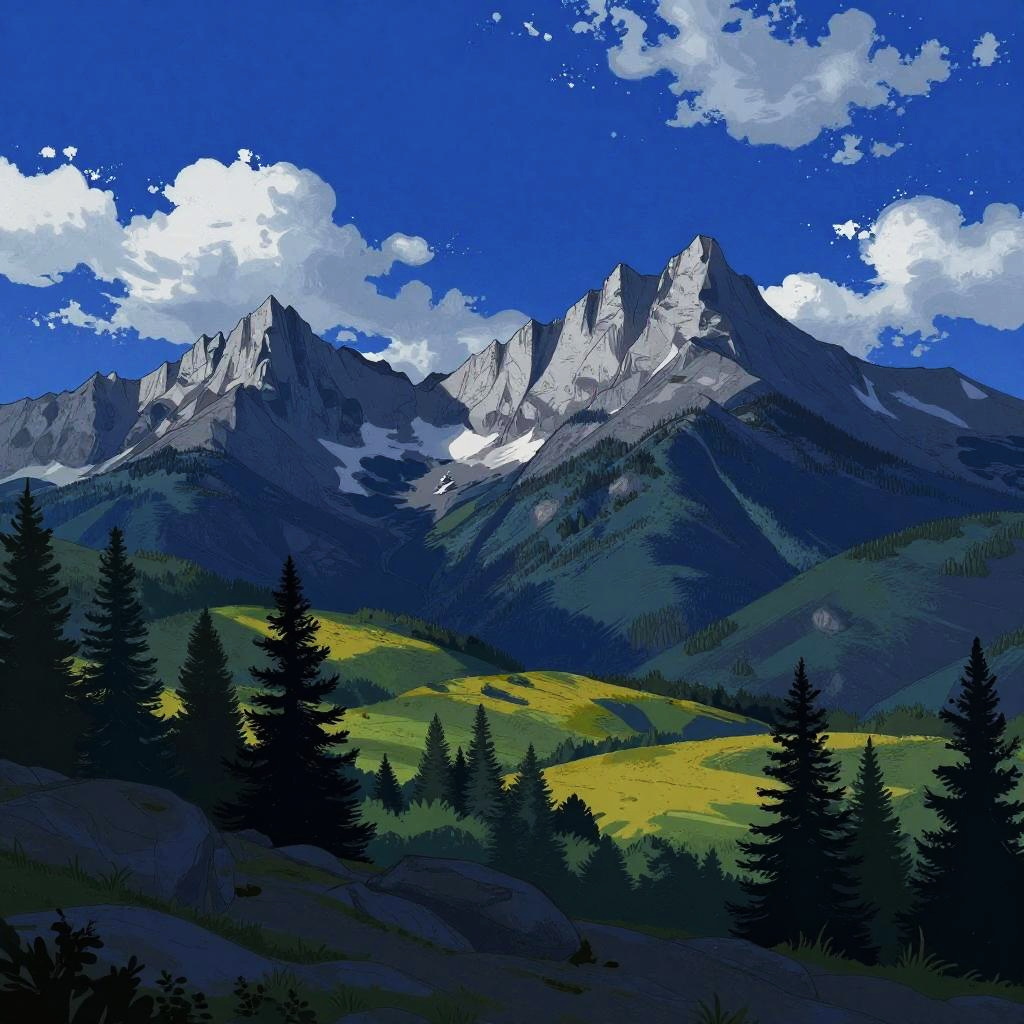 This digital drawing showcases a stunning nighttime landscape. The foreground features a rocky, tree-dotted area leading to a rolling field of green and yellow hues. In the background, towering mountains with jagged, white rock formations rise under a vivid blue sky filled with scattered, bright clouds. The overall color palette is cool, with deep blues and greens dominating the scene.