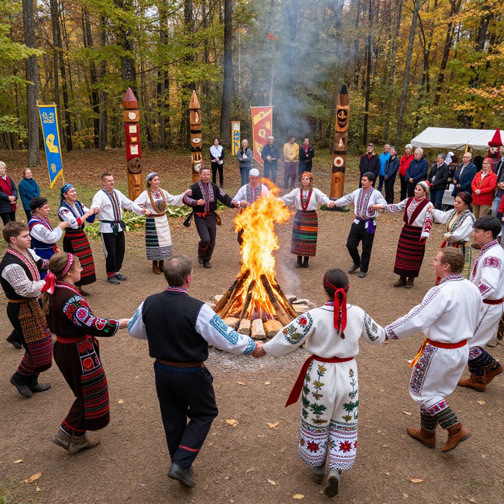 Suevo cultural festival in a forest clearing, people dancing in traditional costumes with embroidered patterns, bonfire in center, wooden totems and banners around, autumn leaves falling, vibrant colors, celebratory and lively mood