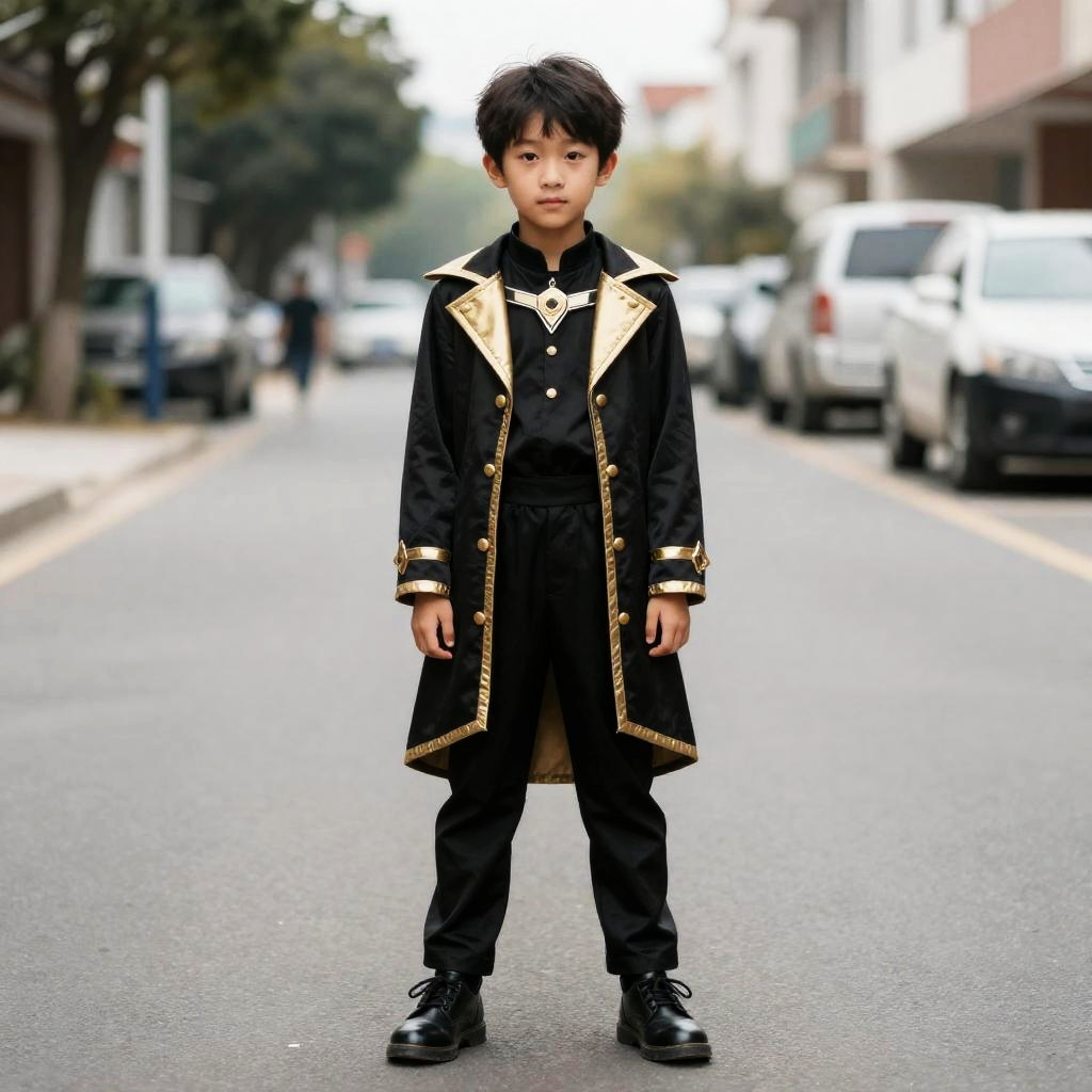 Dark Costume For Boy, boy in a black and gold outfit standing on a street