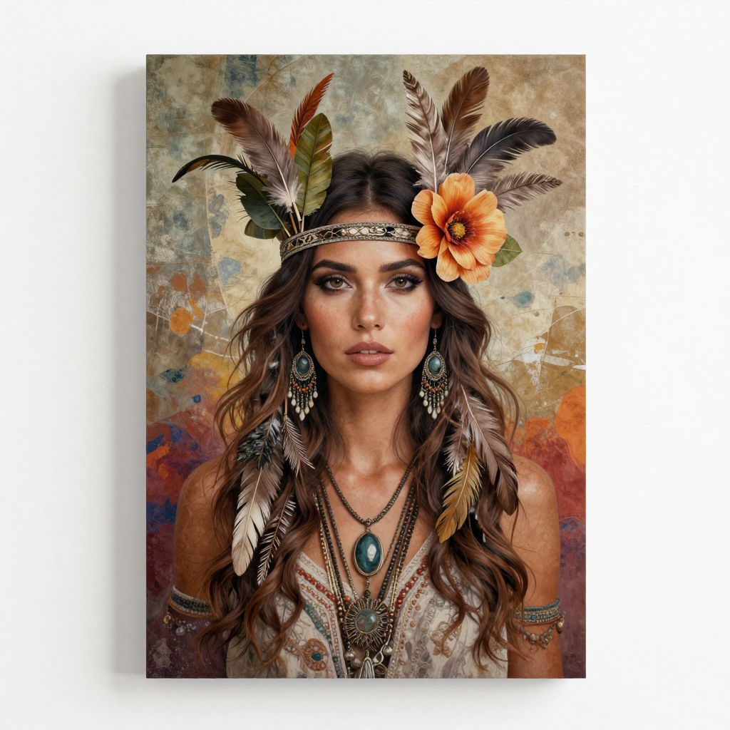 The image depicts a bohemian-inspired art print featuring a woman adorned in intricate, nature-inspired accessories. She wears a headband decorated with feathers, leaves, and a prominent flower, complemented by a necklace and earrings that add to her boho aesthetic. Her hair is long and adorned with additional feathers and leaves, cascading down her shoulders. The background is a blend of earthy tones with splashes of color, creating a textured, almost abstract effect. The overall composition is balanced, with the woman centrally positioned, and the elements around her arranged in a harmonious manner, creating a sense of depth and dimension. The interplay of colors and textures enhances the bohemian vibe, making the print visually engaging and rich in detail.