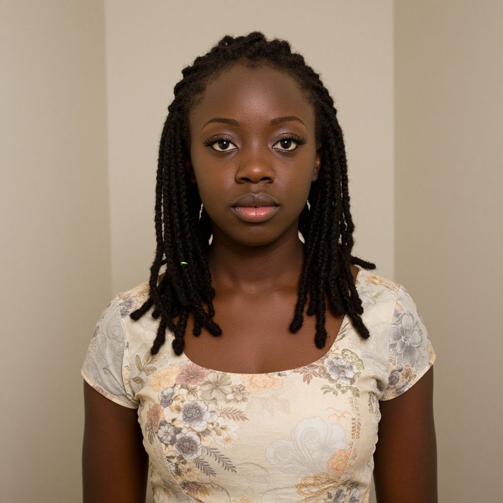 Photograph of a young Black woman with dark skin and long, thin dreadlocks. She has full lips, brown eyes, and is wearing subtle makeup. She is dressed in a short-sleeved, cream-colored top with a floral pattern in gold and silver. The background is a plain, off-white wall, creating a neutral setting that focuses attention on her. She stands directly facing the camera, with a neutral expression. The lighting is even, highlighting her features and the texture of her top. The overall style is straightforward and portrait-like.