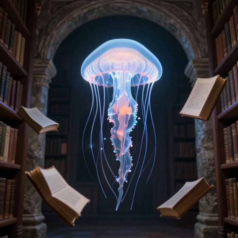 A luminous jellyfish floats serenely above an ancient stone library, its ethereal glow and rhythmic pulsations summoning books to dance in mid-air, defying gravity in a mesmerizing ballet of knowledge and wonder.
