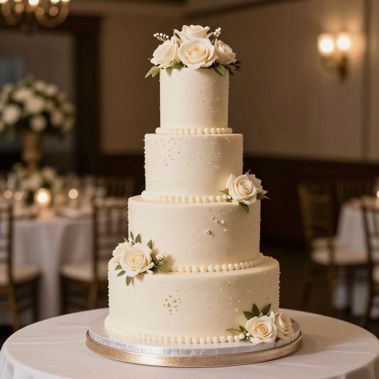 Photograph of a four-tiered white wedding cake adorned with pearl-like dots, cream roses, and green leaves, set on a white tablecloth in