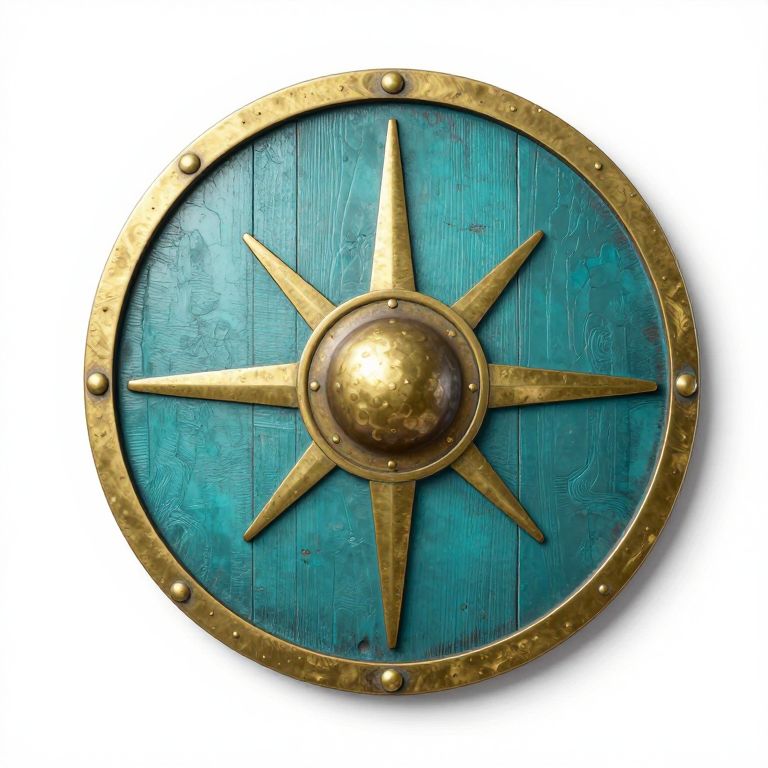 Minimalist Art Viking Maiden Shield, Old Wooden and Brass Style, norwegian, Teal in Color, Brass details, ultra detailed, Showcased on White Background, Vintage Style,
