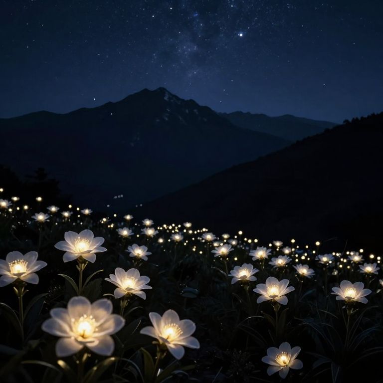 Photograph of a night scene with glowing white flowers in the foreground, a starry sky, and a dark mountain silhouette in the background.