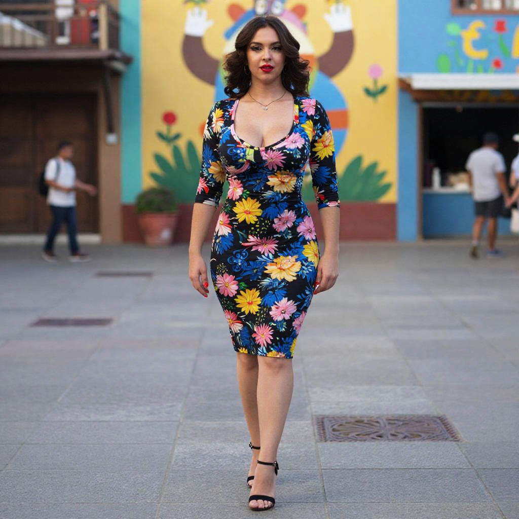 A curvy woman in a knee-length floral bodycon dress with a scooped neckline and three-quarter sleeves, paired with strappy black heels, stands in a vibrant plaza adorned with colorful murals, captured in an oversaturated film style. Sexy. Pretty face and beаutiful eyes. Big breasts
