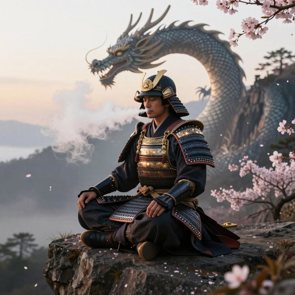 Samurai vape master meditating on a mountain cliff at dawn, exhaling dense, mystical vapor shaped like traditional Japanese dragons, wearing intricate armor with glowing accents, cherry blossoms falling gently, serene and powerful atmosphere.