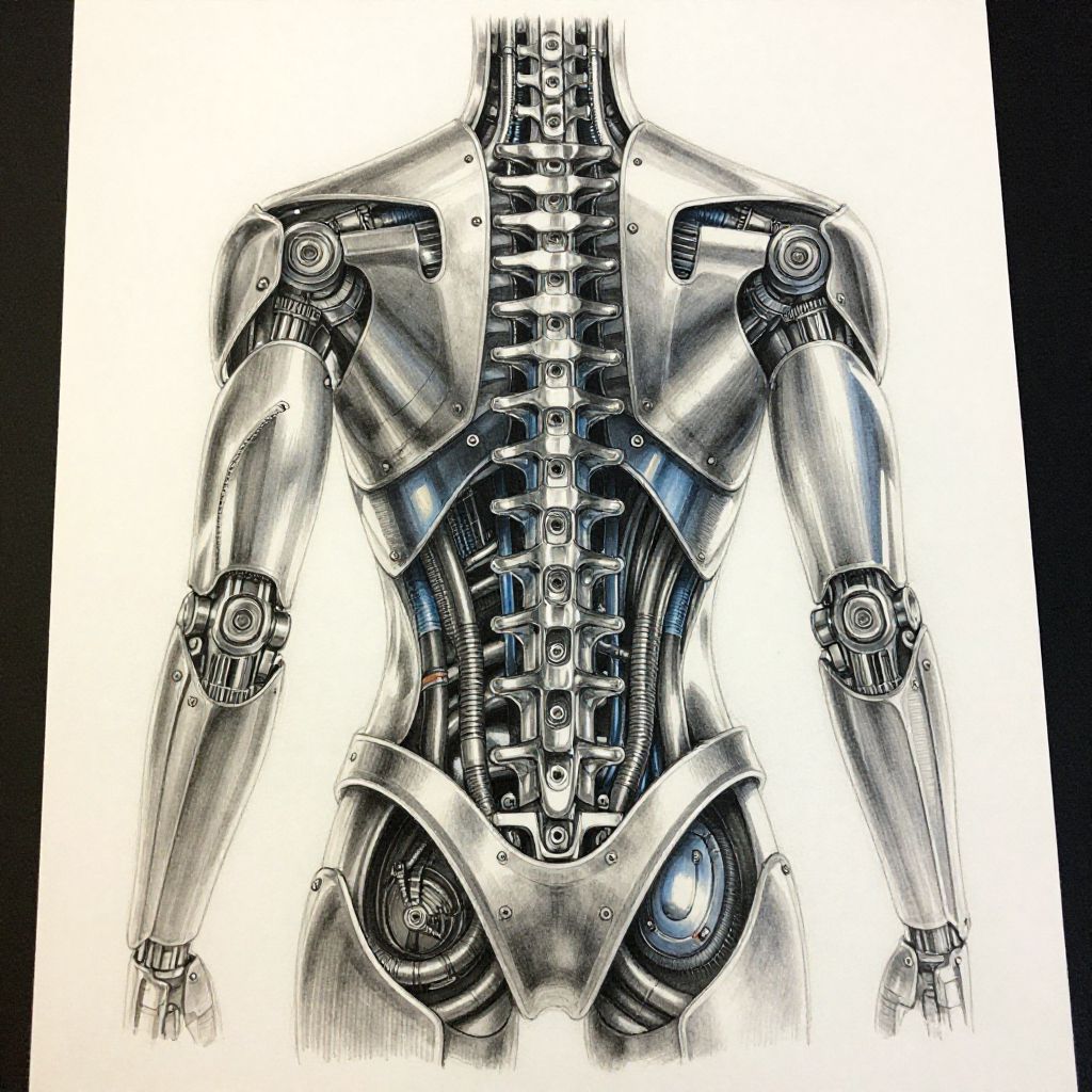 Cyborg biomechanical tattoo drawing of an armored spine with mechanical vertebrae and hydraulic tubing, realistic shading and fine linework, merging human anatomy with machine elements, futuristic concept art with metallic silver and blue hues