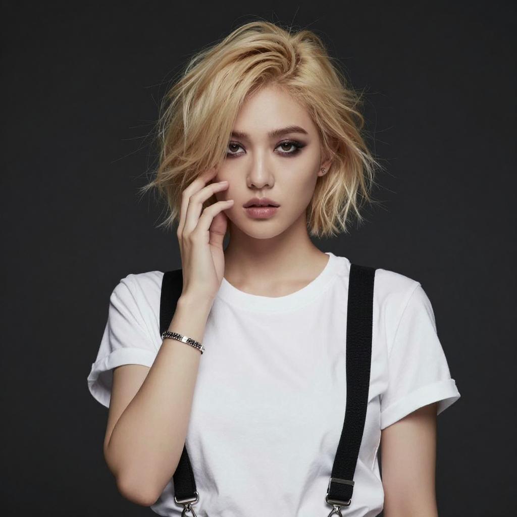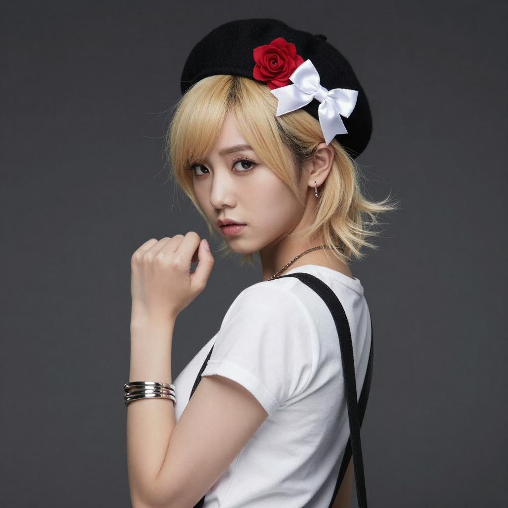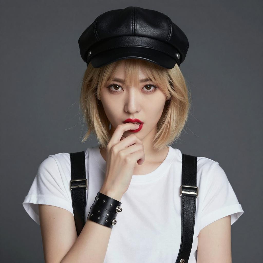 Photograph of a young woman with light skin and short blonde hair, wearing a black leather cap, white t-shirt, black suspenders, and black leather gloves. She has red lipstick, a confident smile, and is holding her suspenders with her right hand. Dark background highlights her edgy, punk-inspired style.