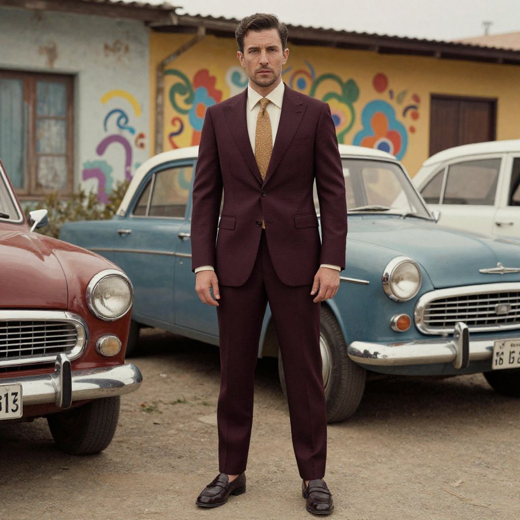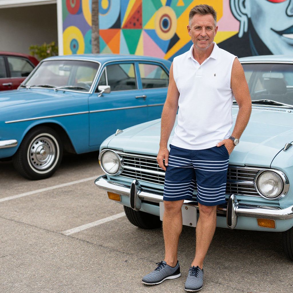 A man, classic white sleeveless polo, navy striped Bermuda shorts, gray synthetic golf shoes, outdoor lot with vintage cars, polaroid instant camera style, relaxed smile, vibrant murals in the background. Man has masculine face and piercing eyes