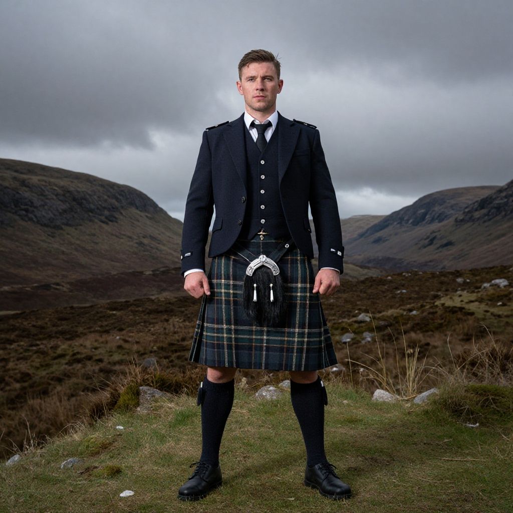 A striking man stands confidently donning traditional Scottish attire, including a kilt and sporran, with a dramatic highland landscape under a brooding sky in the background.