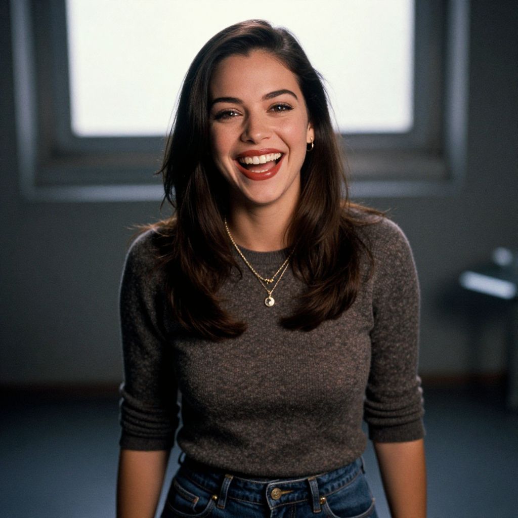 Photo of beautiful (Bl41r31v0ry-140:0.99), a woman, perfect hair, laughing, (modern photo), wearing a (long sleeved sweater:1.2) and jeans with jewelry, portrait, 85mm, (analog, cinematic, film grain:1.3), (__advancedWildcardsScienceFictionKit_v10/advanced-science-fiction-locations__), detailed eyes, professional pose, painted lips, (epiCPhoto), (looking at viewer:1.1), (cinematic shot:1.3), (natural lighting, lit from above)