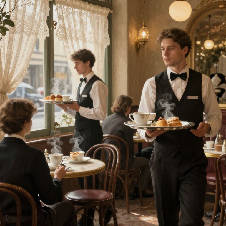 Waiters bustling through a vintage European cafe, carrying silver trays with steaming cups and delicate pastries, soft morning light filtering through lace curtains, warm earth tones, impressionist style painting, cozy and inviting atmosphere.