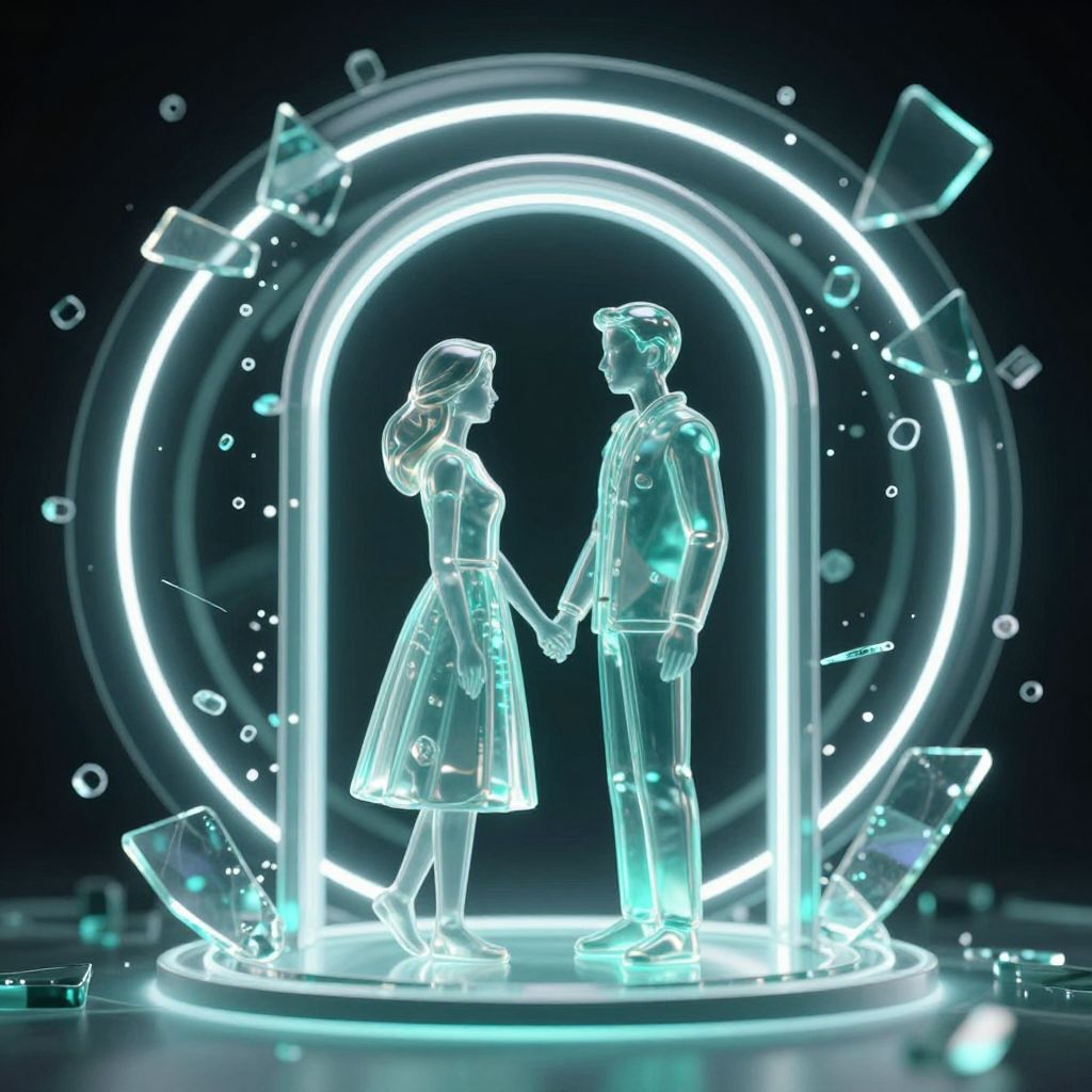 Neon-lit CGI of translucent man and woman holding hands within a glowing circular frame, surrounded by floating glass shards.