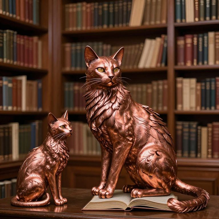 A library where every book is a living creature is guarded by cats who speak forgotten languages and burnished in copper feathers.
