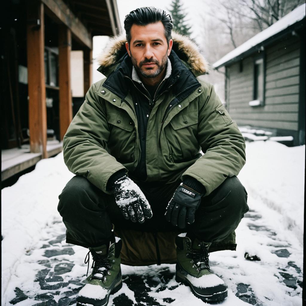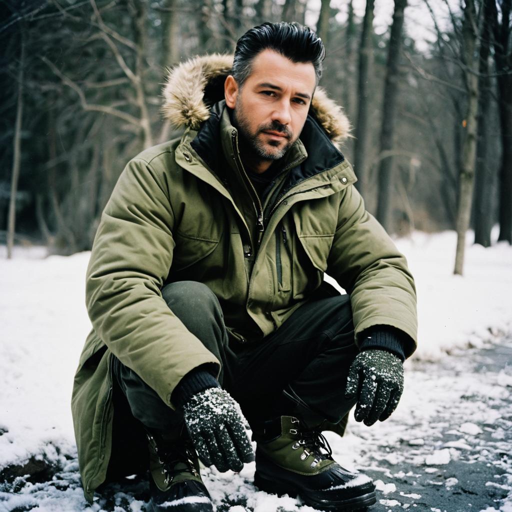 Photo. Rugged Build man, Pompadour, winter outfit, parka jacket in olive green with thermal gloves and black snow boots, kodak sp analog photo