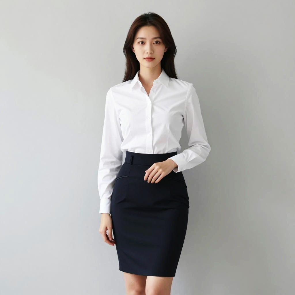 Portrait of a young Asian woman wearing a sophisticated gray checkered short-sleeve dress with a black belt tied at the waist. She stands confidently on an urban street with a blurred modern building background, showcasing a blend of contemporary fashion and elegance.