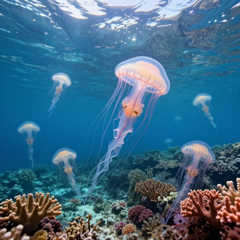 A tranquil underwater scene depicts a thriving coral reef in dreamlike surrealism, akin to Haeckel's biophilic illustrations, teeming with ethereal jellyfish at various life stages gracefully floating through luminous waves that refract a spectrum of colors reminiscent of stained glass. This delicate ballet is captured from an uncommon bird's-eye view above the ocean surface, where sunlight filters through clear blue skies, casting dappled shadows on the gentle undulations below, creating an emotional gradient of wonder and tranquility while subtly alluding to deeper enigmas hidden in the depths.