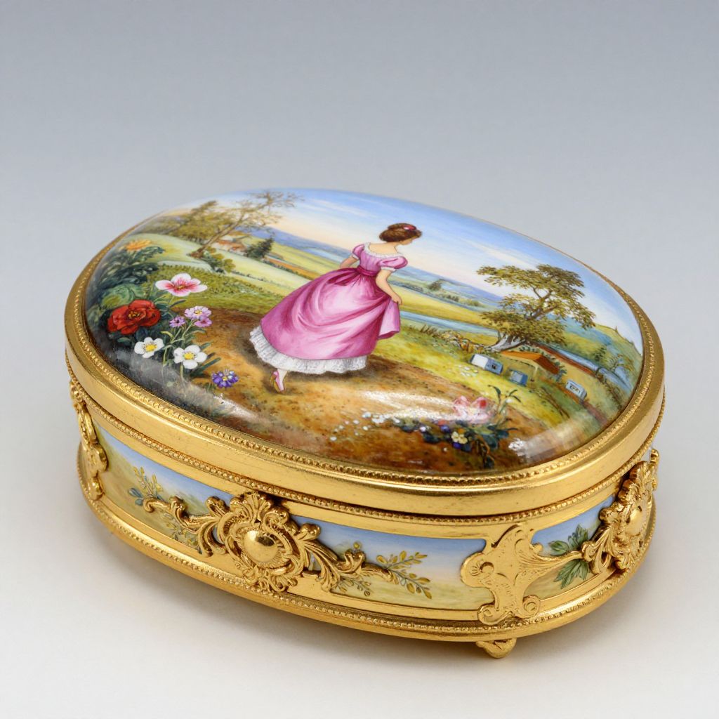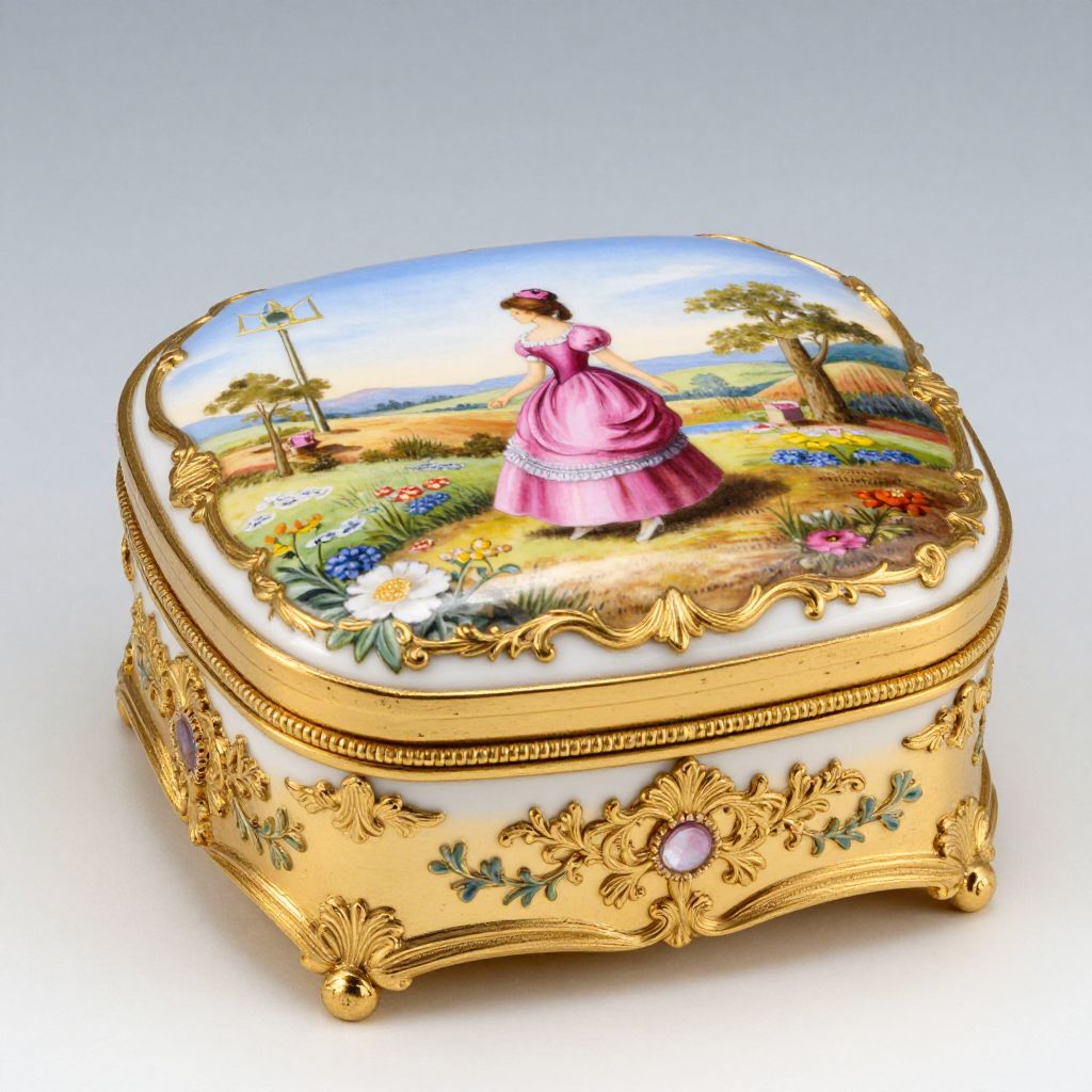 Exquisitely crafted fine 24kt gold-plated porcelain music box featuring a hand-painted lid scene of a woman in a vibrant pink dress walking through a pastoral landscape, adorned with floral motifs and ornate golden embellishments.