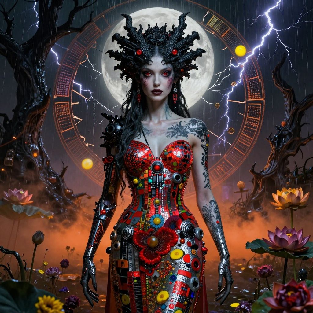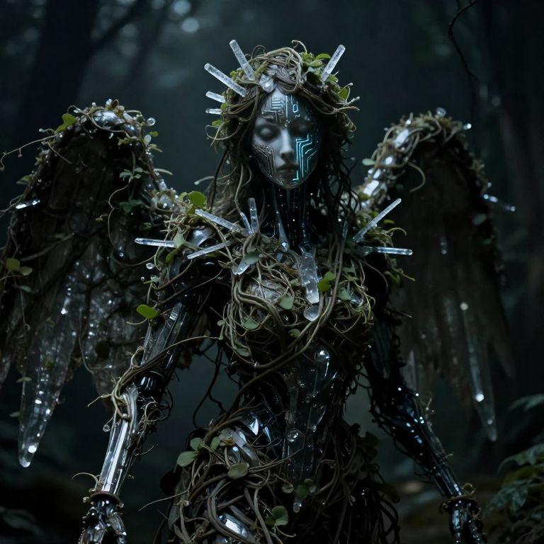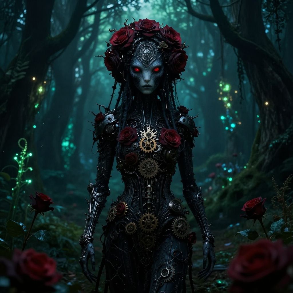 ((cinematic photorealistic full-body portrait, mysterious hybrid creature, dark floral, mechanical elements, enchanted forest, bioluminescent trees, glowing plants, thorny roses, intricate gears, piercing crimson eyes, eerie light, surreal landscape, sinister harmony, nature, technology), haunting, intricate pattern, UHD 4k wallpaper, H.R. Giger, Brom, Dave Rapoza, Abigail Larson)