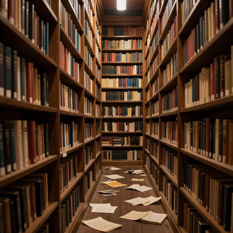 Photograph of a narrow, dimly-lit library aisle lined with tall, wooden bookshelves filled with a diverse array of books in various colors and sizes. The shelves stretch into the distance, creating a vanishing point effect. The dark wooden floor is scattered with crumpled papers, adding a sense of disorder. A single, overhead fluorescent light casts a soft glow, highlighting the rich textures of the wood and the books' spines. The overall atmosphere is quiet and scholarly, evoking a sense of history and intellectual pursuits.