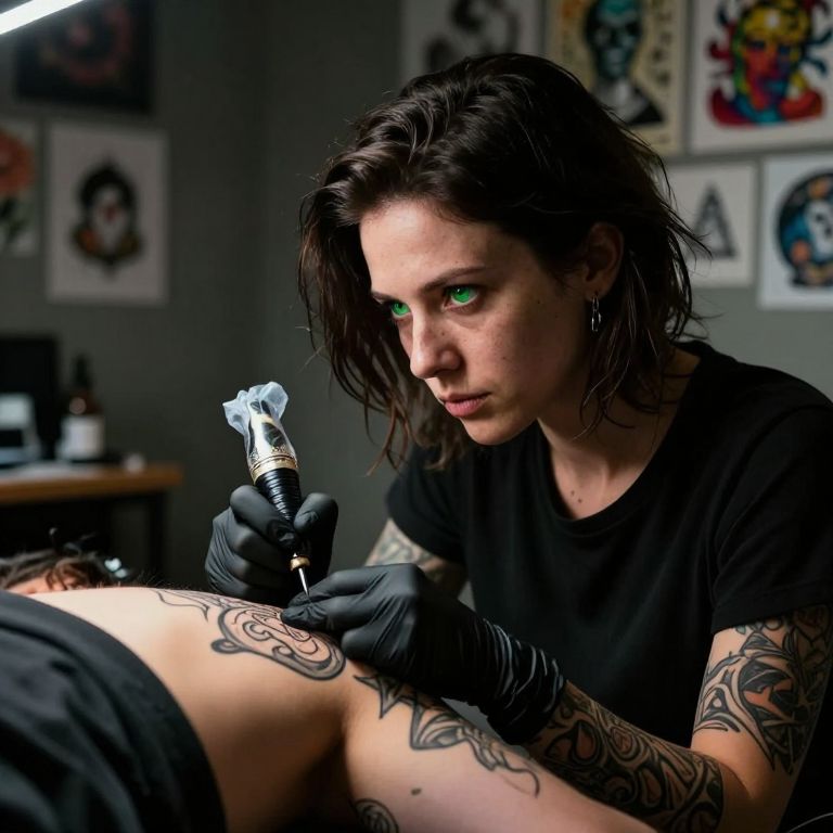 Craft an ultra-realistic portrait of a mysterious tattoo artist with captivating green eyes, situated in a dimly lit studio adorned with colorful ink illustrations on the walls. Depict her with intense focus as she skillfully etches intricate patterns onto a willing subject's skin, her years of experience and passion for her craft reflected in her every movement. The scene should evoke a spectrum of emotions, from the pain endured during the tattooing process to the satisfaction and excitement of the art itself, all conveyed through subtle micro-expressions and nuanced body language. Utilize dramatic lighting techniques reminiscent of chiaroscuro, illuminating her hands and accentuating her face with light while casting long shadows that dance across the room, enhancing the captivating atmosphere and highlighting the raw, intense nature of this artistic endeavor.