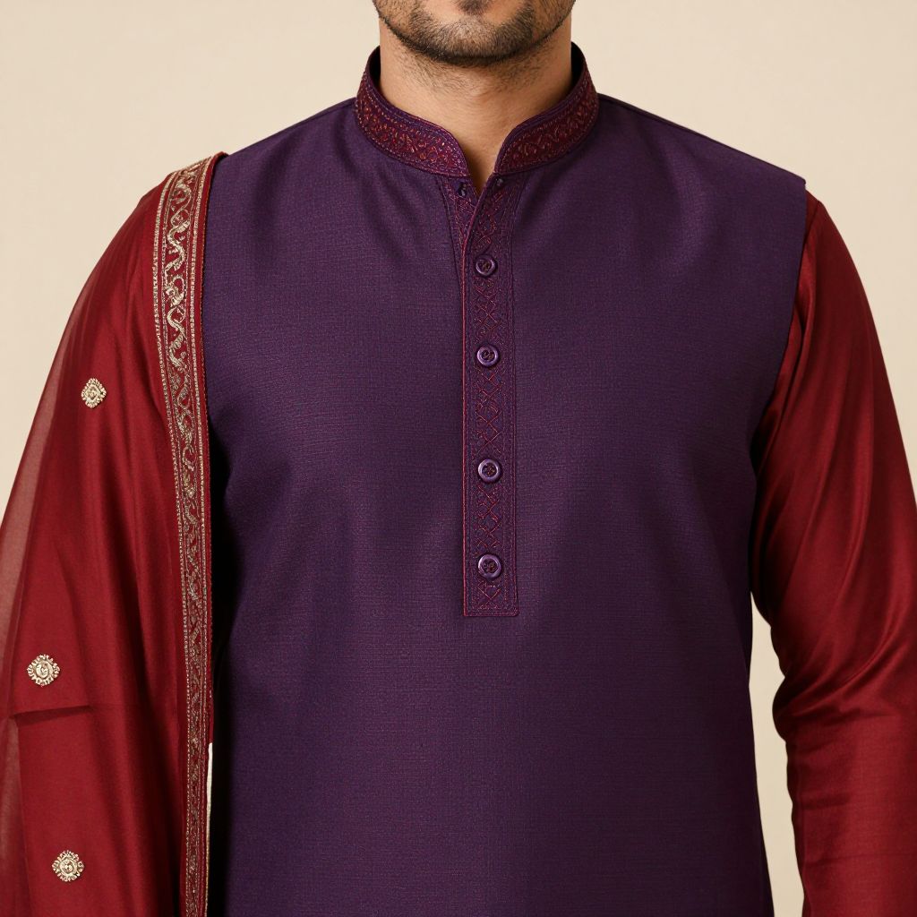 Photograph of a man from the neck to the waist, wearing a deep purple, long-sleeved, button-up kurta with intricate dark red embroidery along the collar and buttons. The kurta is paired with a matching deep red sheer kurta pyjama, visible on the left sleeve, adorned with similar embroidery and a small, silver embellished button. The man has a short, dark beard and a light skin tone. The background is plain white, highlighting the rich colors and textures of the garments. The image emphasizes traditional South Asian men's attire.