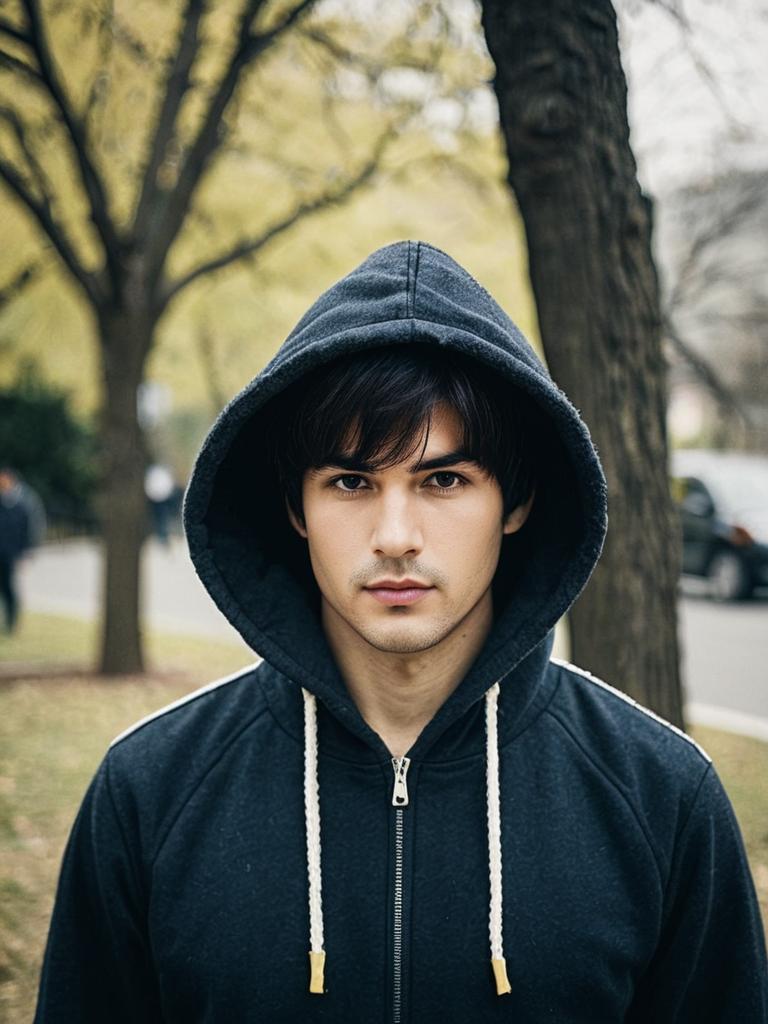 Adult peely costume, solo, 1boy, blurry background, hood, male focus, blurry, hood up, outdoors, realistic, black hair, upper body, looking at viewer, short hair, day, tree
