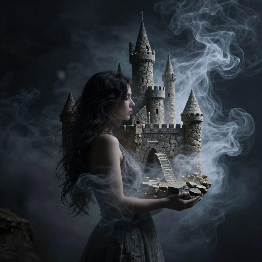 Where dreams intertwine with reality, a woman's silhouette cradles an ethereal castle of smoke and stone, embodying the transient beauty of hope and the haunting melancholy of unattainable aspirations.