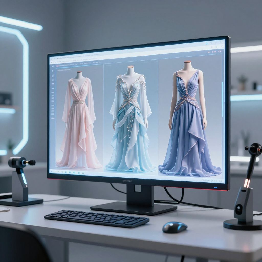 Scene of free AI clothing generator software on a holographic display, creating unique garments with flowing fabrics and intricate details, set against a minimalist futuristic workshop with glowing neon accents and advanced tailoring tools.