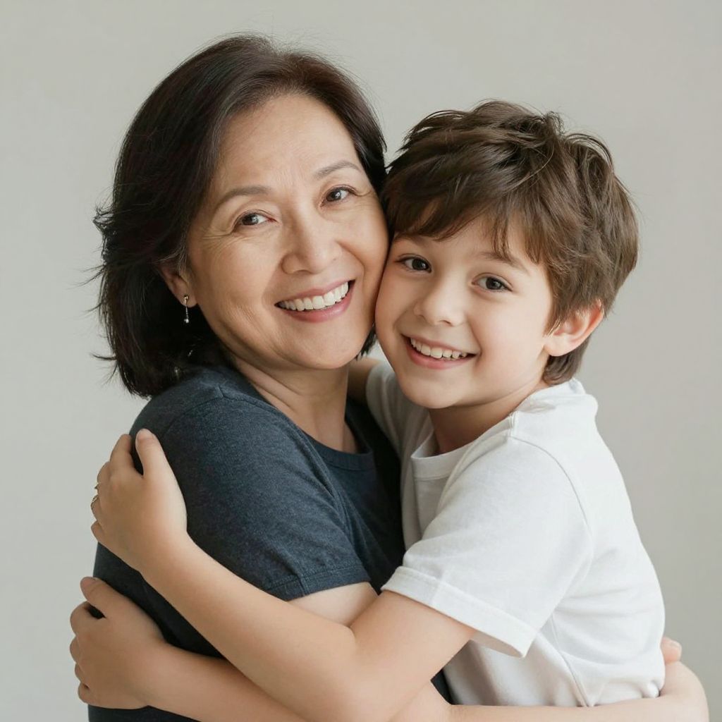 Grandmother and grandchild share a warm embrace, with the older woman's arms gently encircling the younger child, both smiling brightly against a soft, neutral background.