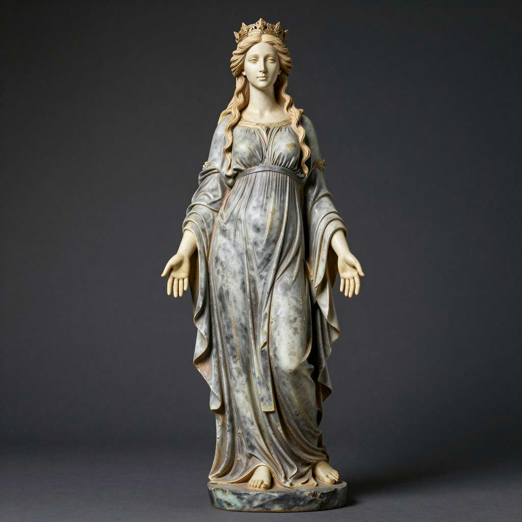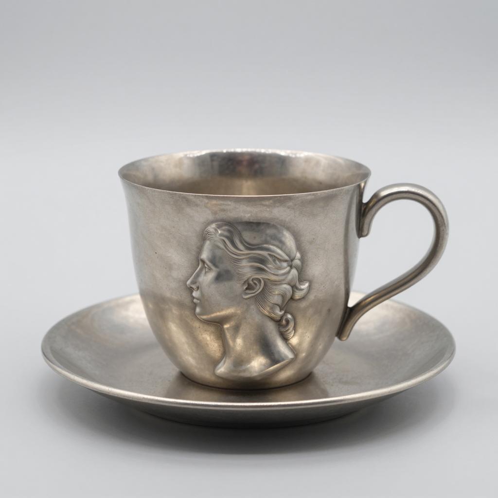 Metal teacup with a human profile, featuring a circular handle, rests on a matching saucer with a curved base. The teacup is in the foreground, slightly to the right. The background is a plain, light-colored surface. The teacup and saucer have a smooth, reflective ure.