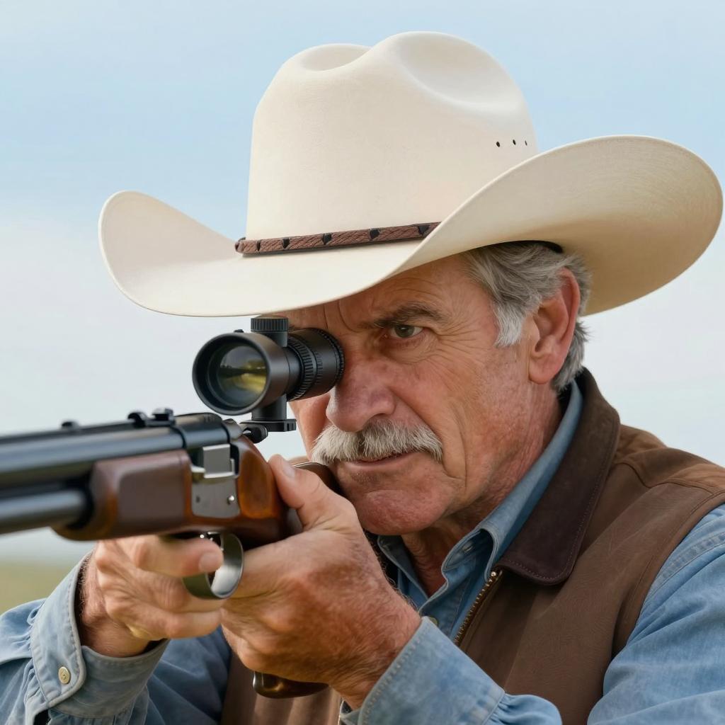 A middle-aged white man with a mustache, wearing a light blue shirt, white cowboy hat with black band and feather, and a holster with a revolver. Another man with a similar white cowboy hat and white shirt is in the background. The background includes blurred figures and a stone structure. The man in the foreground has a serious expression.