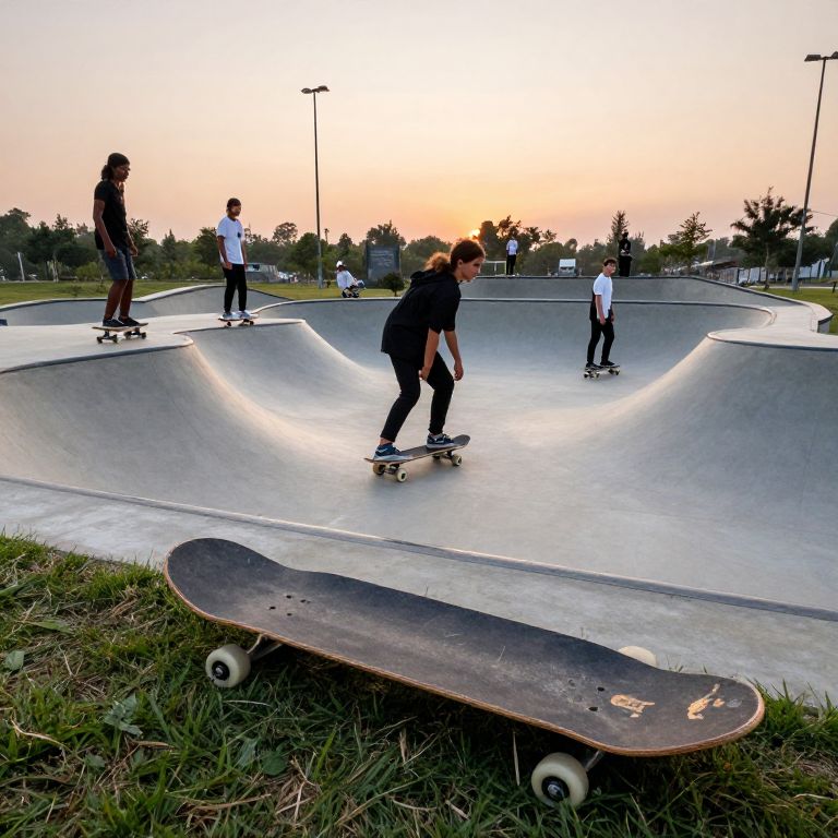 A wide-angle image of a modern skatepark at dusk, featuring a group of friends aged 18–25 with diverse features—some with bright eyes and athletic builds—skateboarding on a smooth concrete ramp, with a large wooden board lying nearby on the grass, dented and worn, under a fading orange sky and streetlights.