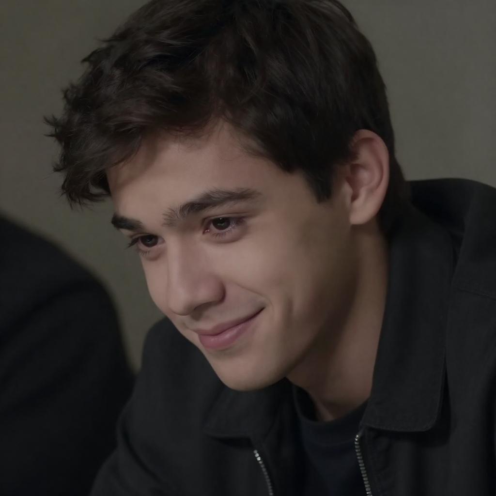 Portrait of a young man with shoulder-length brown hair wearing a black sleeveless shirt. He is seated in a dimly lit room, looking to the side with his mouth slightly open. Behind him, there are multiple guitars including a black acoustic, a brown electric, and a white electric guitar, creating a musical atmosphere.
