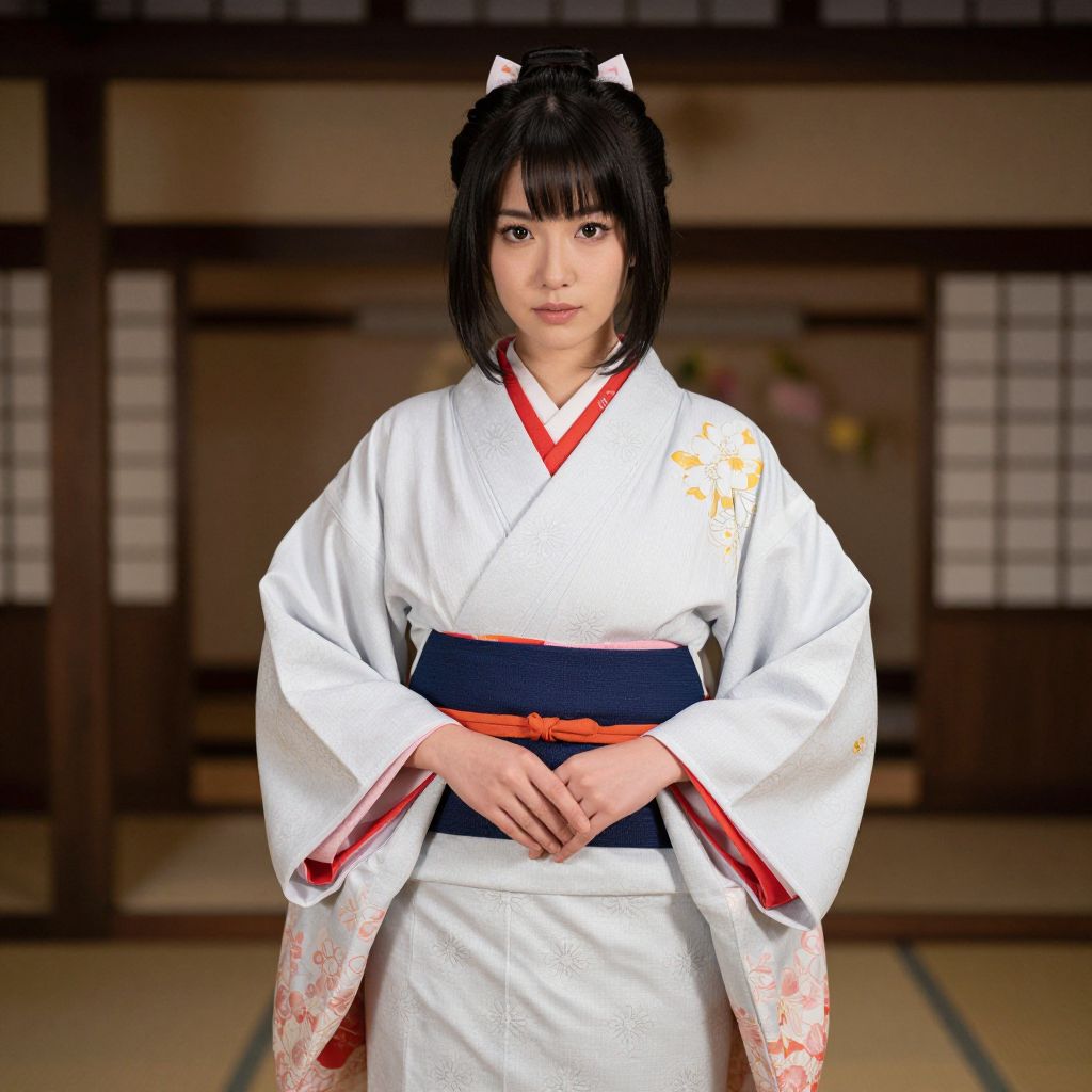 Photograph of a young Japanese woman with fair skin and black bob-cut hair, adorned with a white hair clip. She wears a traditional white kimono with red and gold floral patterns on the sleeves, and a navy blue obi belt with an orange sash. Her hands are gently clasped in front. She stands in a traditional Japanese room with wooden shoji screens and a tatami mat floor. The background is softly blurred, emphasizing her as the focal point. The lighting is soft, highlighting the textures of her kimono and the serene atmosphere of the setting.