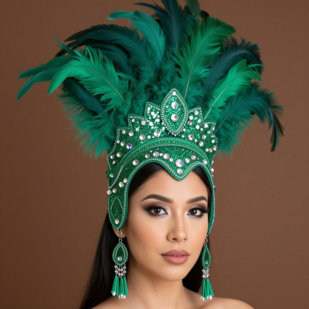 Photograph of a woman with medium brown skin and dark, smoky eyeshadow. She wears an elaborate, green and turquoise Mardi Gras-style headpiece adorned with sparkling jewels, large green feathers, and intricate patterns. Her earrings match the headpiece, featuring similar jewels and green feather accents. She has dark, arched eyebrows, full pink lips, and a slight, confident smile. The background is solid black, highlighting her vibrant headpiece and makeup. Her expression is poised and elegant, exuding a sense of regality and festivity.