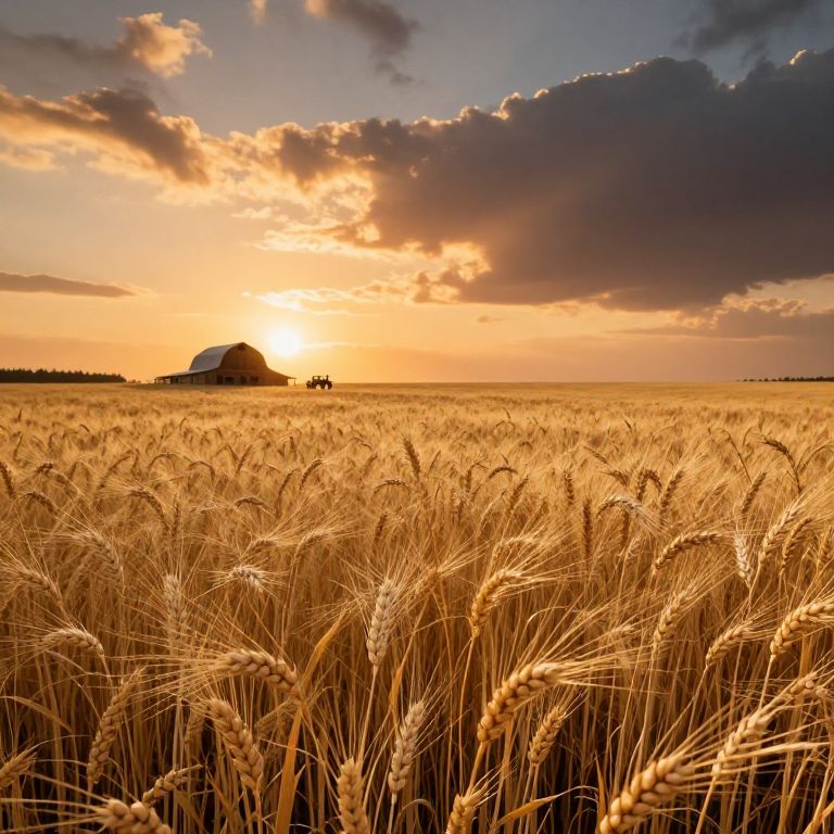 Bonanza of golden wheat fields stretching to the horizon under a dramatic sunset, ripe crops swaying gently in the breeze, a rustic barn and old tractor in the background, showcasing rural abundance and natural beauty.