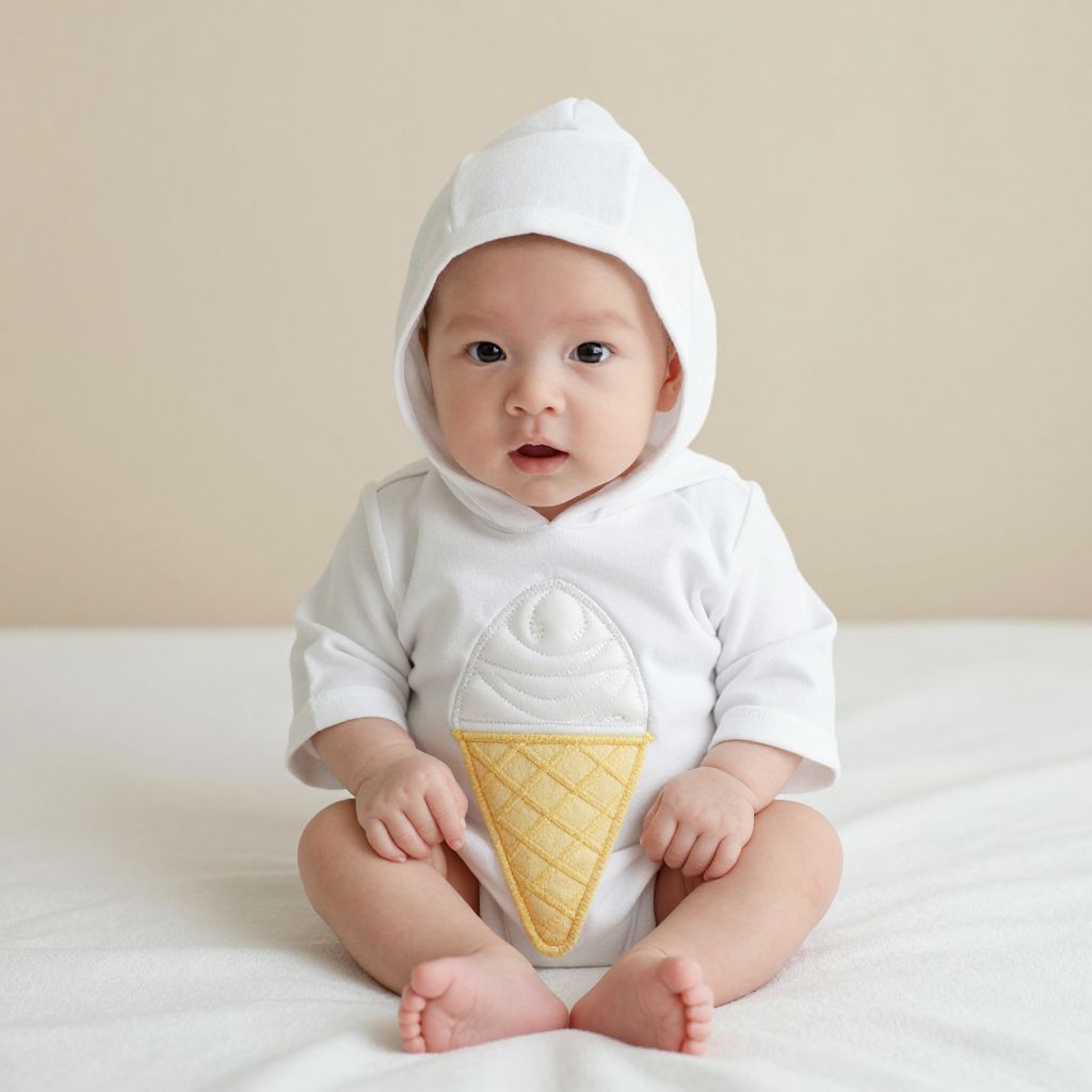 Photograph of a baby with fair skin, sitting on a white surface, wearing a white hooded onesie with an ice cream cone design, against