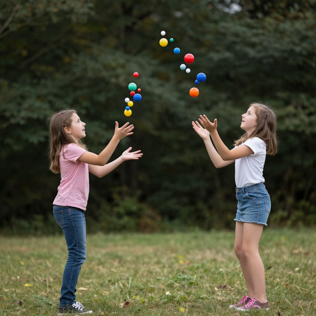 Two children engage in a whimsical game of catch with a cascade of vibrant, gravity-defying spheres that float and scatter mid-air, creating a surreal dance of color and motion.
