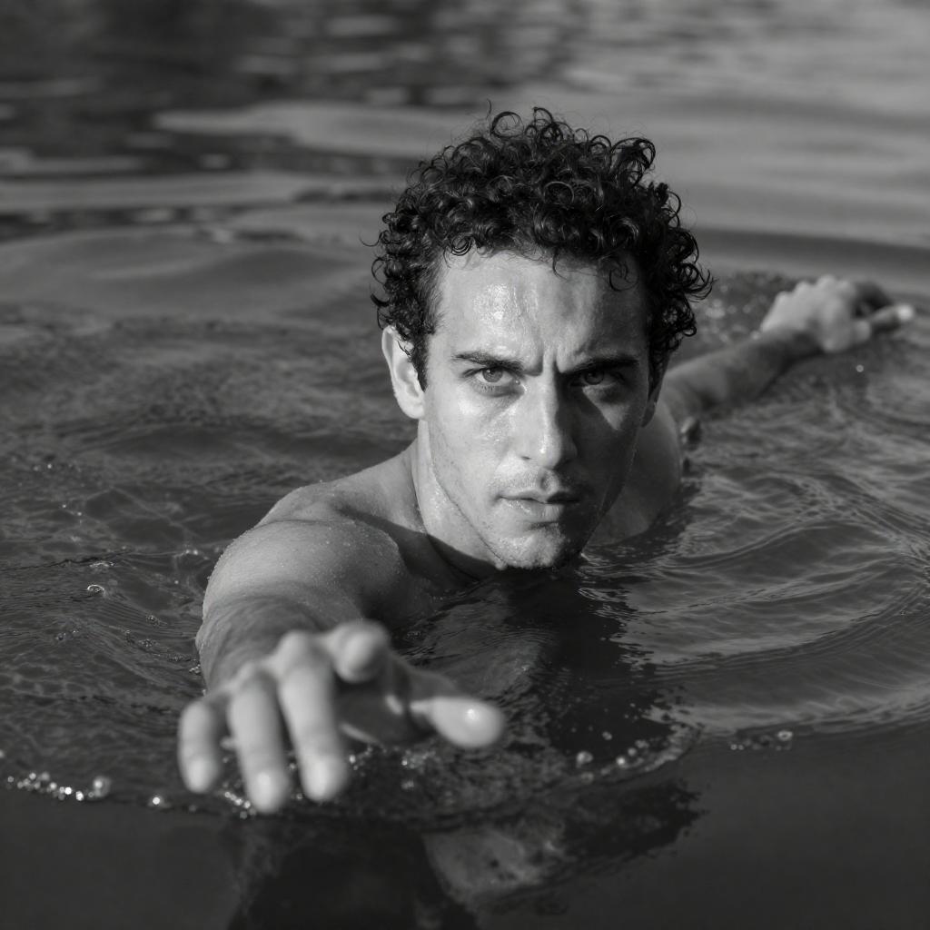 Black-and-white photograph of a curly-haired man with a focused expression, reaching forward with his right hand while partially submerged in dark water. His left hand is behind him, and light reflections create dramatic contrasts. The background is blurred, emphasizing his intense gaze and movement.