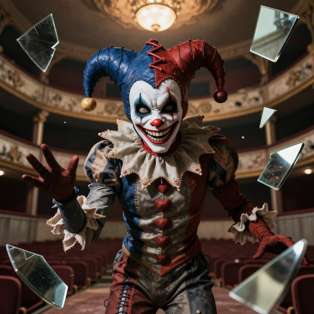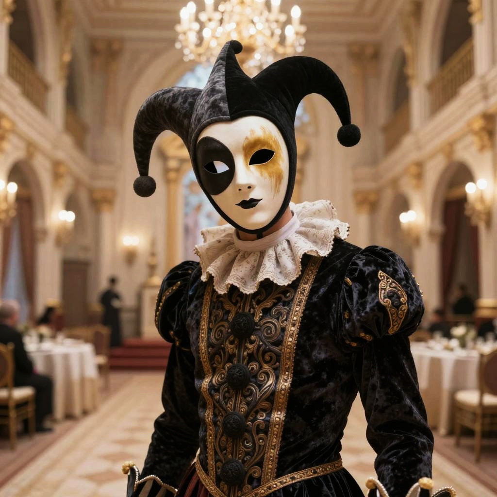 Realistic photo.TCG Artwork. A sinister jester with half faded mask covering one eye wearing a dark velvet ensemble with ornate patterns, standing in a brightly lit but empty celebration hall. realistic photo