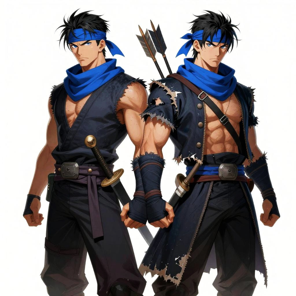 Digital anime-style illustration of two muscular, black-haired ninjas with blue headbands, torn black clothing, and blue scarves, holding swords.